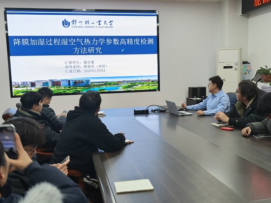 在研究生学术汇报环节,同学们围绕能源、储能、节能技术等多个前沿方向展开分享。杨林以“壁面及多孔内溶液蒸发动力学特性研究”为题,揭示了多孔结构微纳尺度下溶液蒸发传质机理及其对强化相变换热的重要作用;陈一平通过“含高岭石孔隙中地层液体对氢气赋存及扩散损失的分子动力学研究”,结合分子动力学模拟,阐明了地层水在多孔介质中与氢气的竞争吸附机制及其对氢气长期封存安全性的影响;秦佳豪以“氢降膜加湿过程湿空气热力学参数高精度检测方法研究”为题,基于实验数据提出了一种适用于降膜加湿过程的湿空气热力学参数高精度实时检测方法;杨乐滨围绕“基于数字孪生的HVAC系统建模及多变量协同优化研究”,实现了系统负荷与能耗的高精度预测及跨工况泛化;盛宇健以“高功率芯片的歧管微射流与微通道复合冷板的流动与传热特性研究”为题,探讨了喷嘴与销翅密度分布等结构参数及微通道对系统压降与散热性能的影响;王铭超以“低温等离子体预处理对青柠干燥特性及品质影响研究”为题,揭示了低温等离子体预处理对青柠干燥过程及产品品质的作用规律与机理。